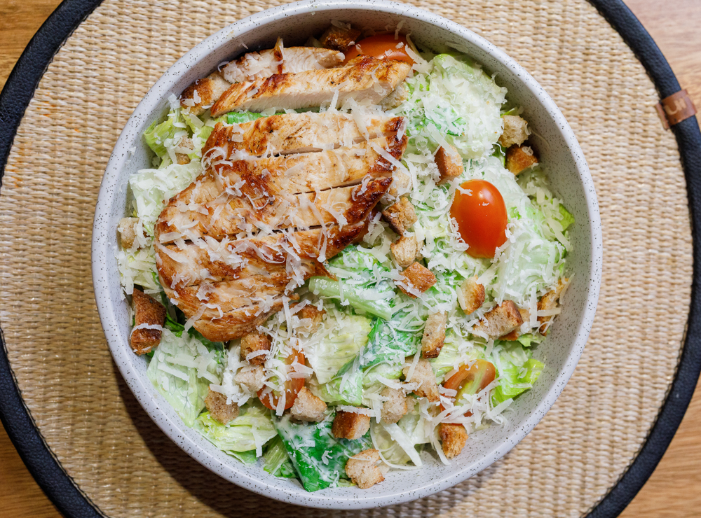 Romaine lettuce , Caesar sauce , grilled chicken , cherry tomato , parmesan cheese and crouton . Total Calories: 890 - Total Protein: 40.2 - Total Carbs: 41.2