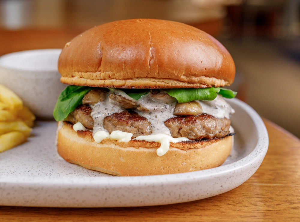 Beef patty (150gr), mayo, rocket leaves, mozzarella cheese, truffle sauce and fresh mushroom